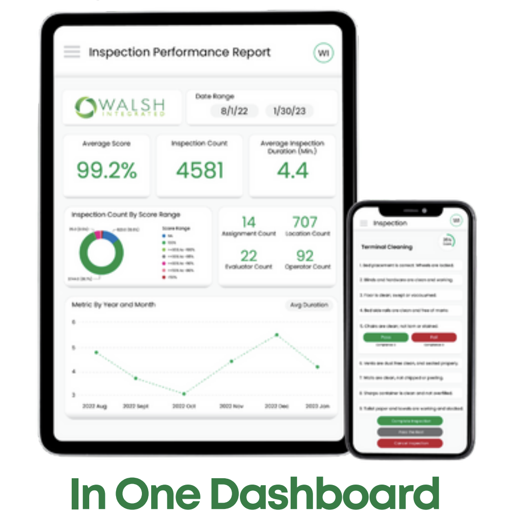 The system-wide average of roughly 3 minutes per inspection shows that standardized forms and workflows keep each inspection brief while still producing high scores; the Walsh platform reduces waste and simplifies documentation.